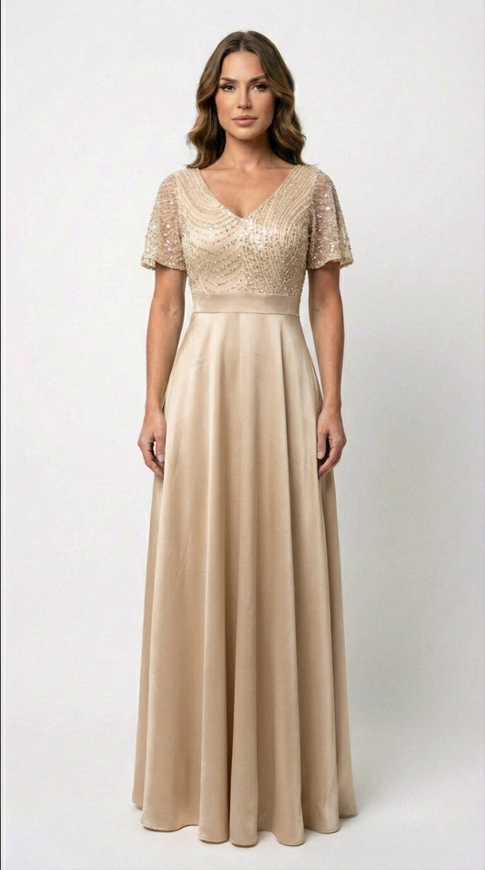 Vestido Largo satinado con abertura y Mangas- KARIME SATIN