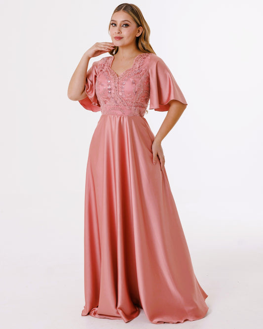 Vestido Largo satinado con abertura y Mangas- KARIME SATIN