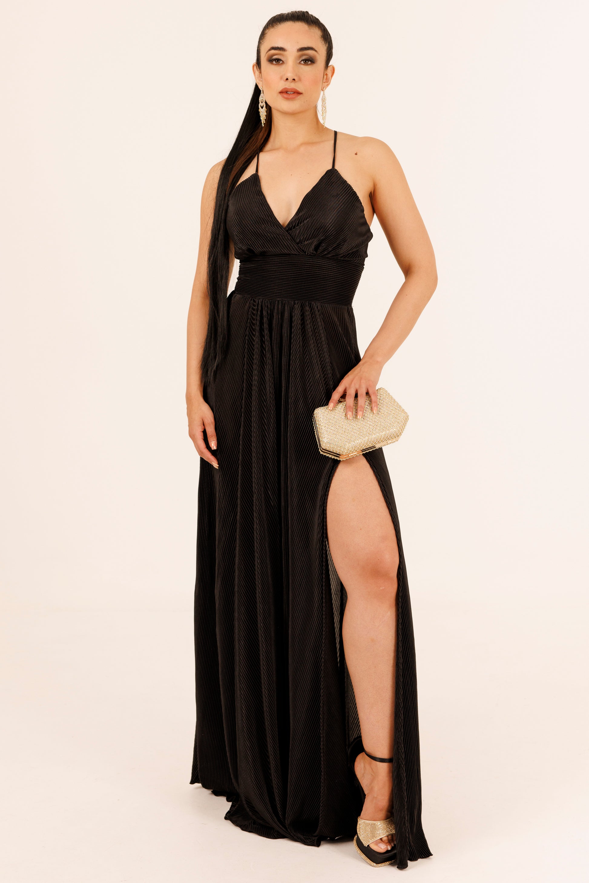 Tejido y Textura: La característica más notable es el plisado vertical (a menudo llamado plisado plissé o acordeón) que cubre toda la tela, desde el corpiño hasta el dobladillo, dándole un gran movimiento y caída. El tejido parece tener un acabado brillante o satinado.